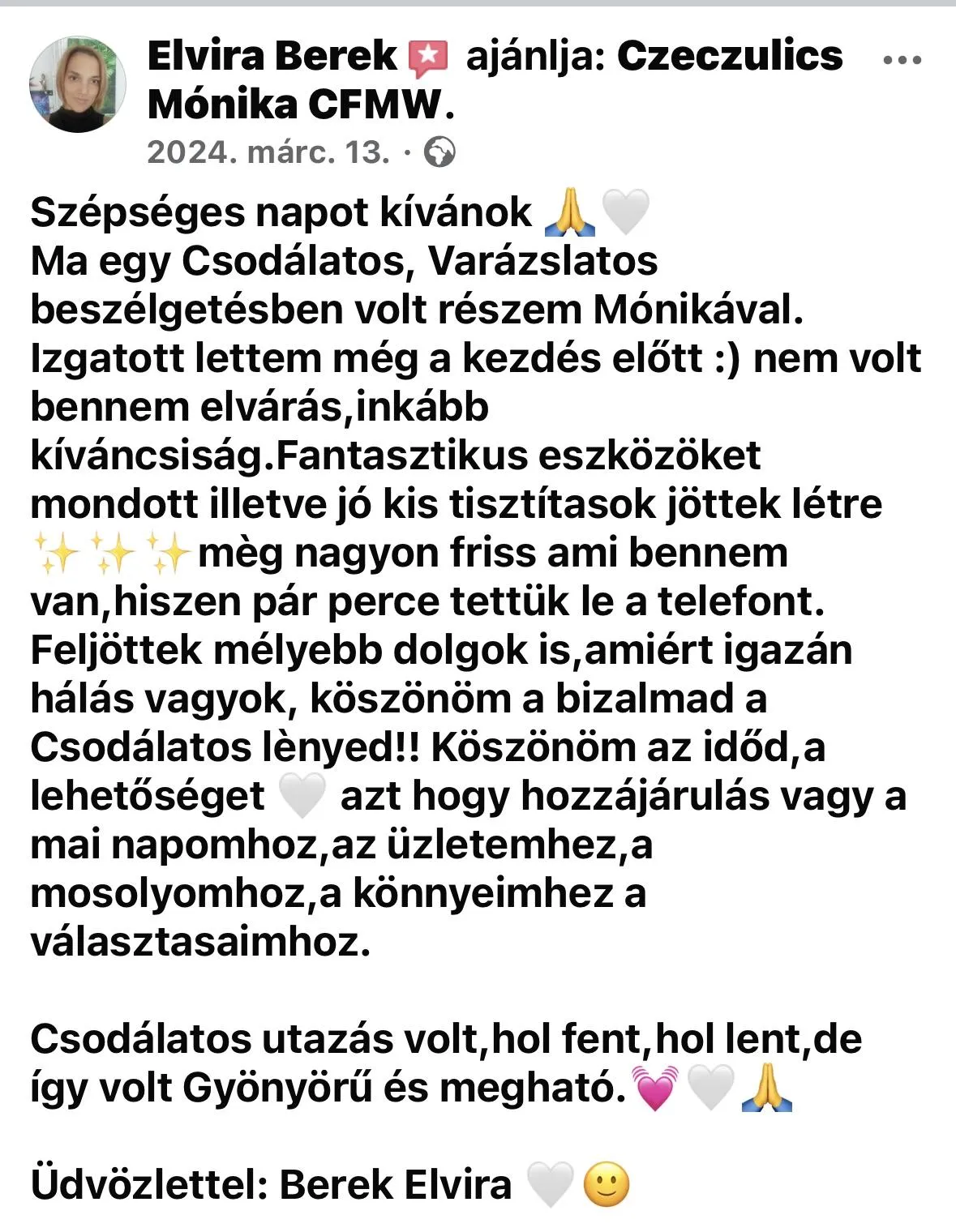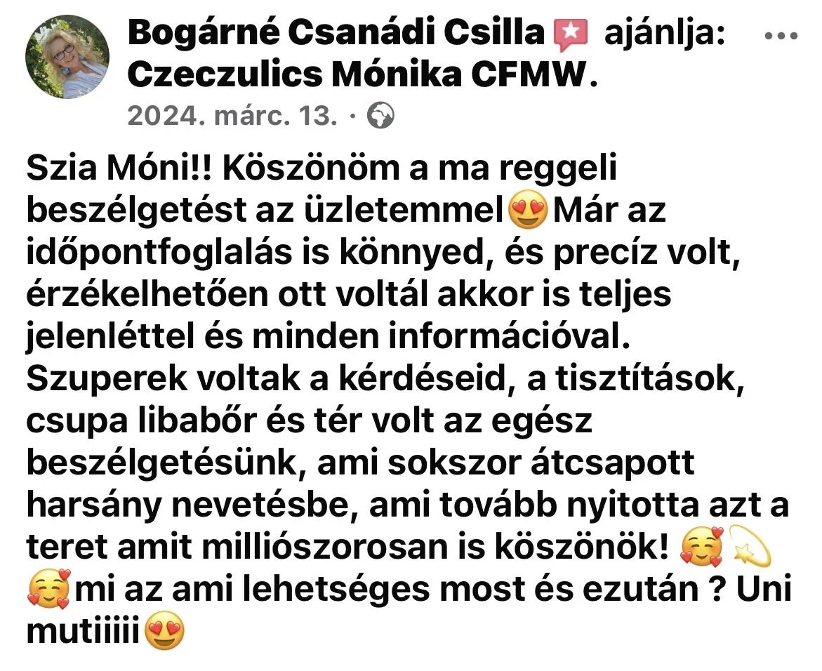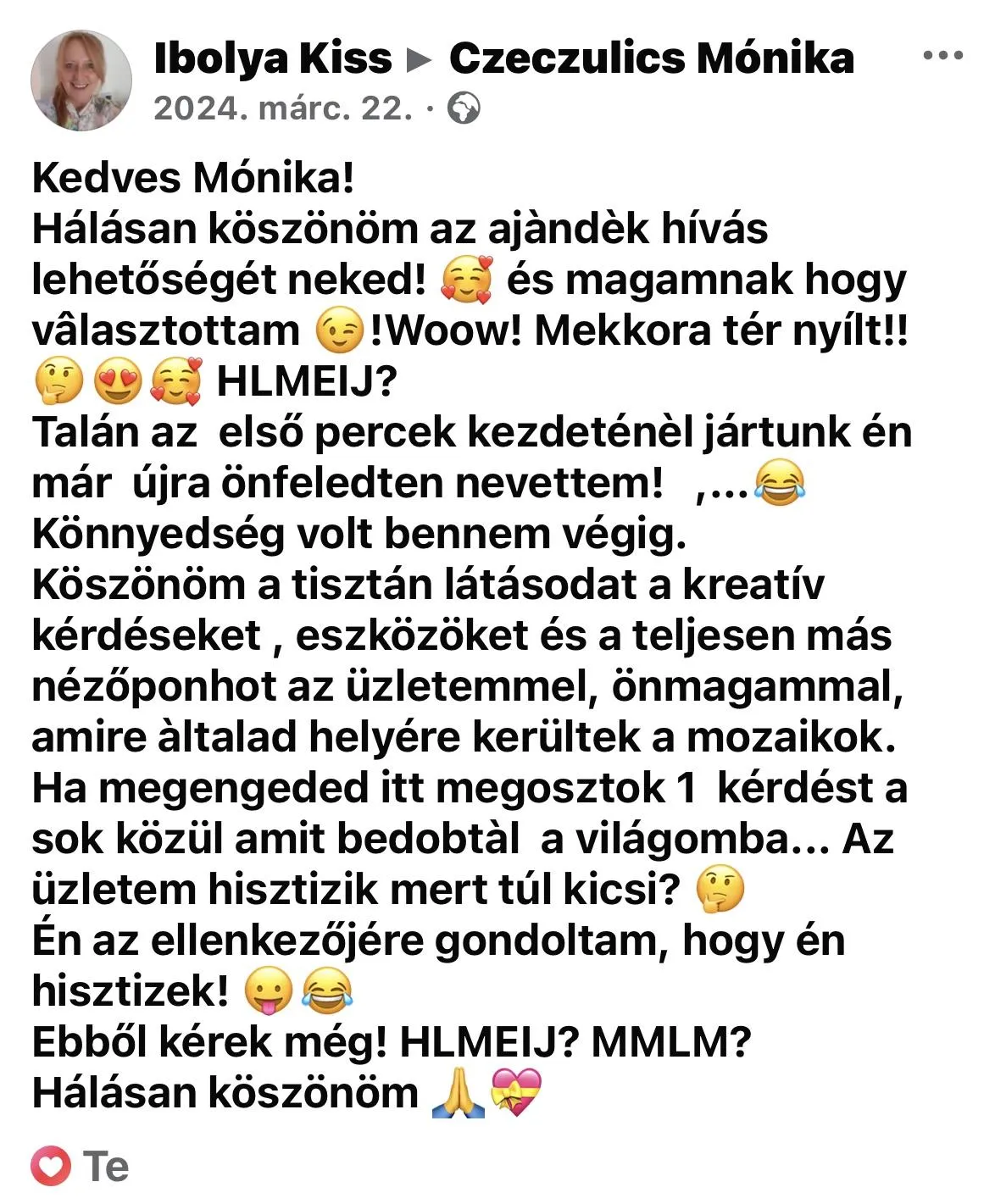 Szia, Czeczulics Mónika vagyok és vállalkozói üzleti tapasztalatomat 2012-ben kezdtem Németországban, ahol első kézből ismerhettem meg a külföldi üzleti környezet kihívásait és lehetőségeit. 2017-ben hazaköltöztem Magyarországra, és elkezdtem gyakornokként dolgozni egy könyvelőirodában, miközben a külföldi exválllalkozói partnerem egyik napról a másikra kizárt a kinti cégünkből, amiben minden befektetésem volt és 0-val álltam itthon egy gyakornoki fizetéssel. Ebben az időszakban nagyon sokszor mondták nekem, hogy itthon nem lesz annyi bevételem, mint külföldön. Majd 3 hónappal a hazaköltözésem után vállalkozó lettem, és a havi bevételem elérte a külföldi havi fizetésemet.